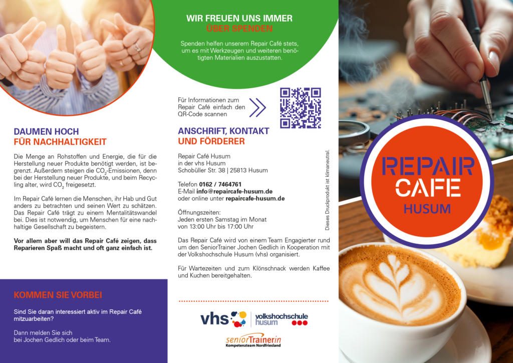 Ab 2026 finden Sie uns in neuen Räumlichkeiten in der Volkshochschule (vhs) Husum, Schobüller Straße 38. Das erste Repair Café im neuen Jahr findet am Sonnabend, dem 7. Februar 2026 von 13 – 17 Uhr statt.